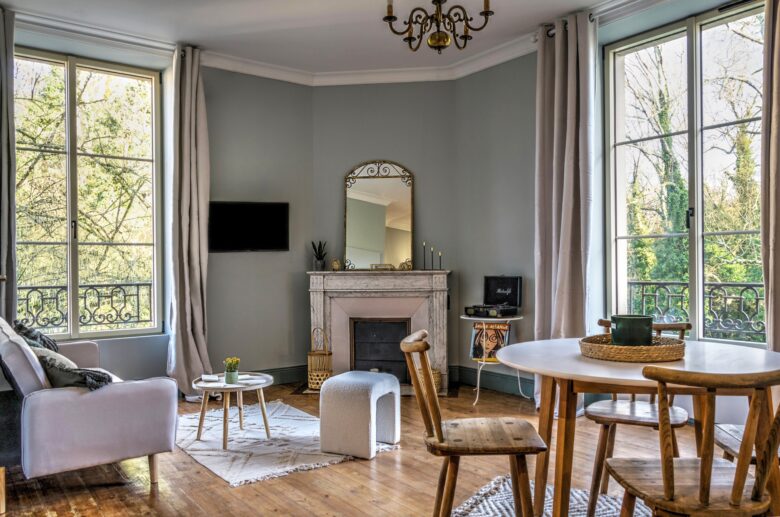 Logement avec lit 160 cm, table et 2 chaises accompagnés d’un tourne disque.