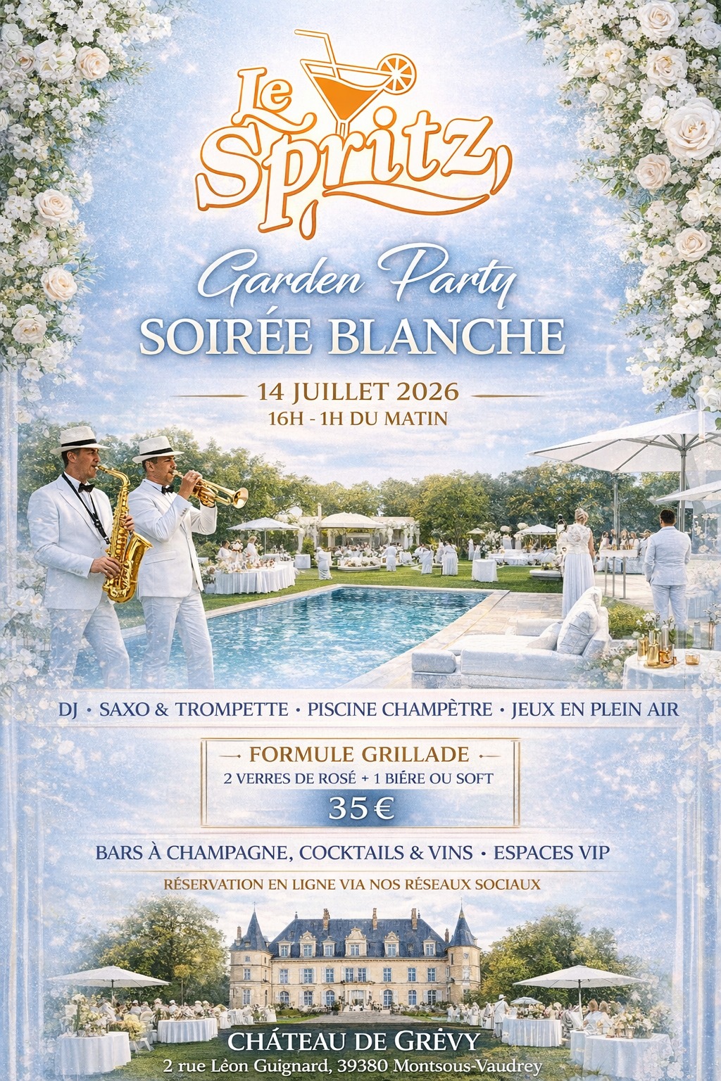 Château Grevy 2 rue Léon Guignard, Mont-Sous-Vaudrey, FranceEXCEPTIONNELAprès avoir gardé précieusement le secret, nous pouvons enfin vous annoncer l'organisation de la première GARDEN PARTY du Spritz.Le temps d'une journée, nous délocaliserons le Spritz au château de GREVY ...