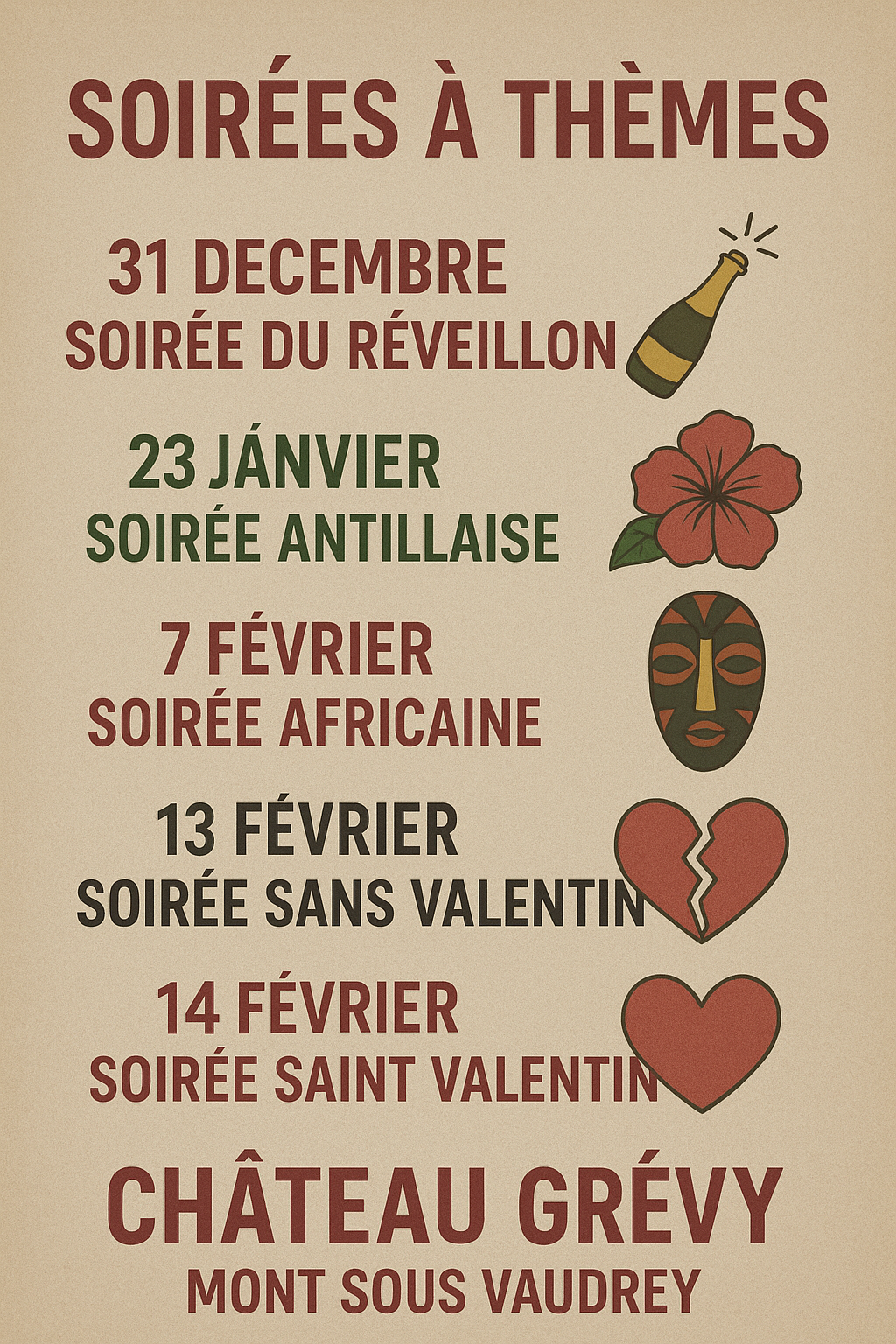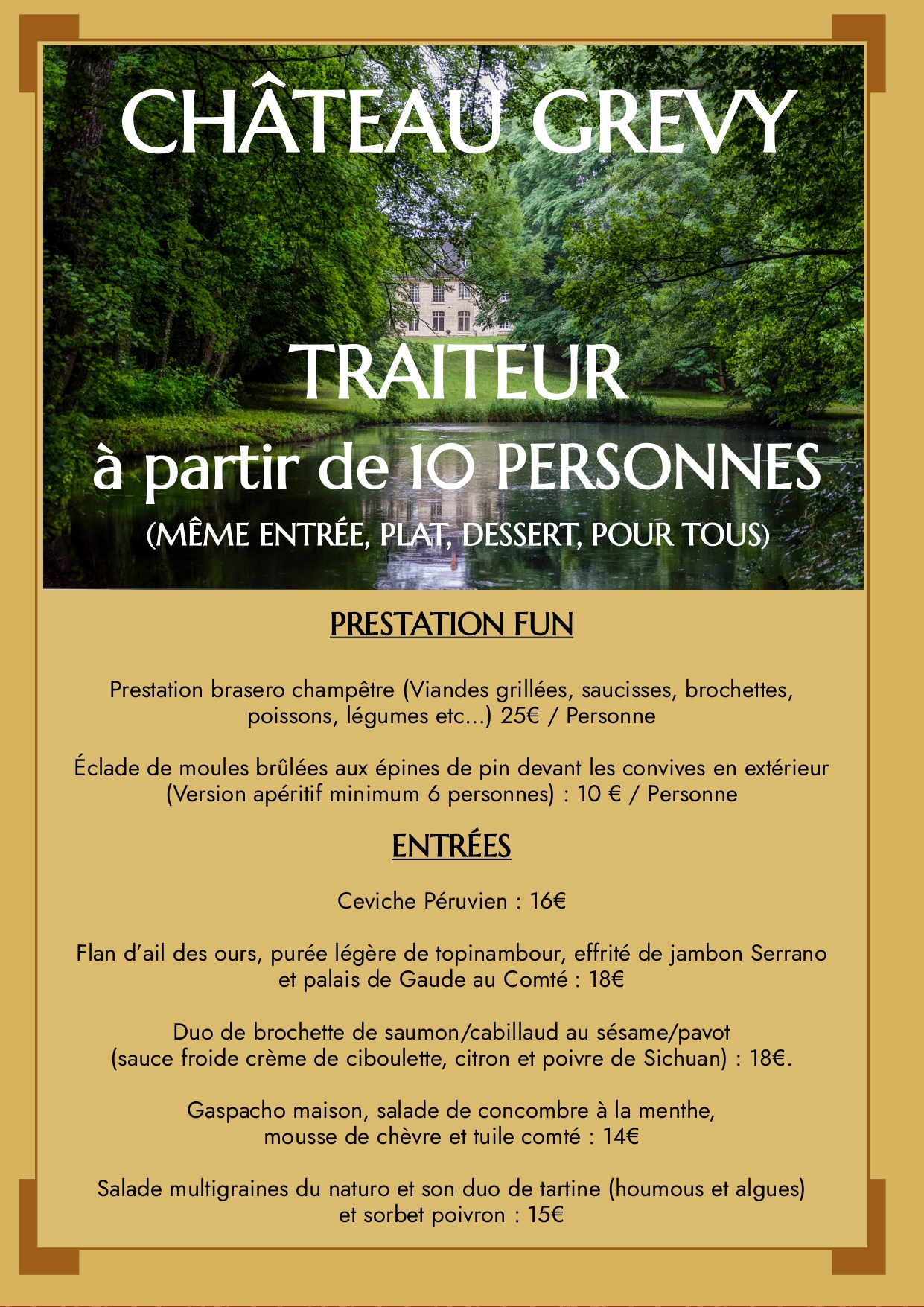 Le Château Grévy vous ouvre ses portes pour vivre vos plus beaux moments dans un lieu unique. Notre établissement se réinvente et se consacre exclusivement à l’accueil de vos événements privés ou professionnels. Le restaurant devient un espace privilégié pour vos baptêmes, mariages, anniversaires, séminaires et autres célébrations, dans une ambiance élégante et chaleureuse. Dès 15 personnes, profitez d’un intérieur raffiné, d’un extérieur verdoyant et d’un cadre naturel qui sublime chaque instant. Notre équipe met tout son savoir-faire à votre service pour créer une expérience sur mesure, avec des plats et menus adaptés à vos envies. Réservez dès aujourd’hui votre lieu d’exception et offrez à vos invités un moment inoubliable, où gastronomie, nature et convivialité se rencontrent.